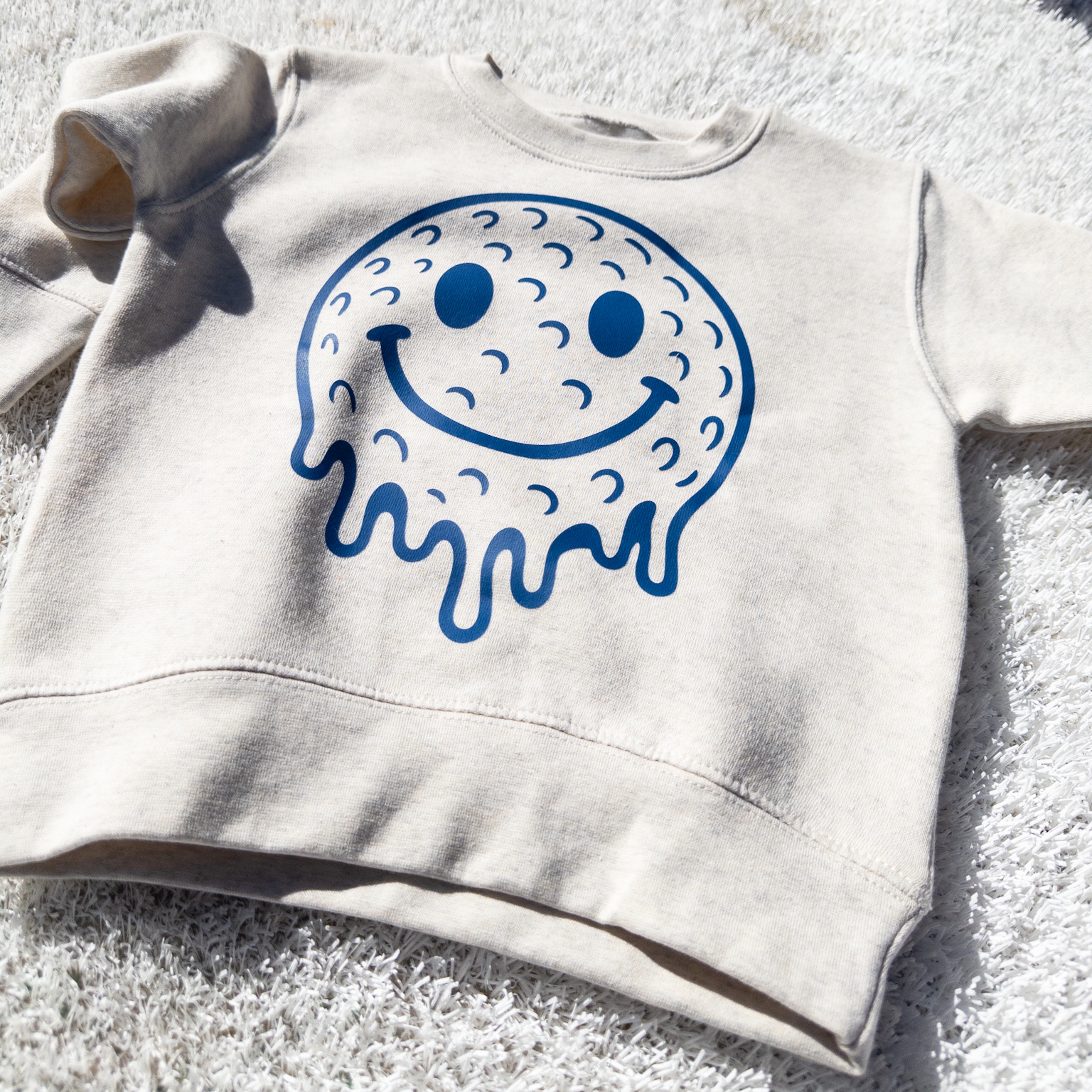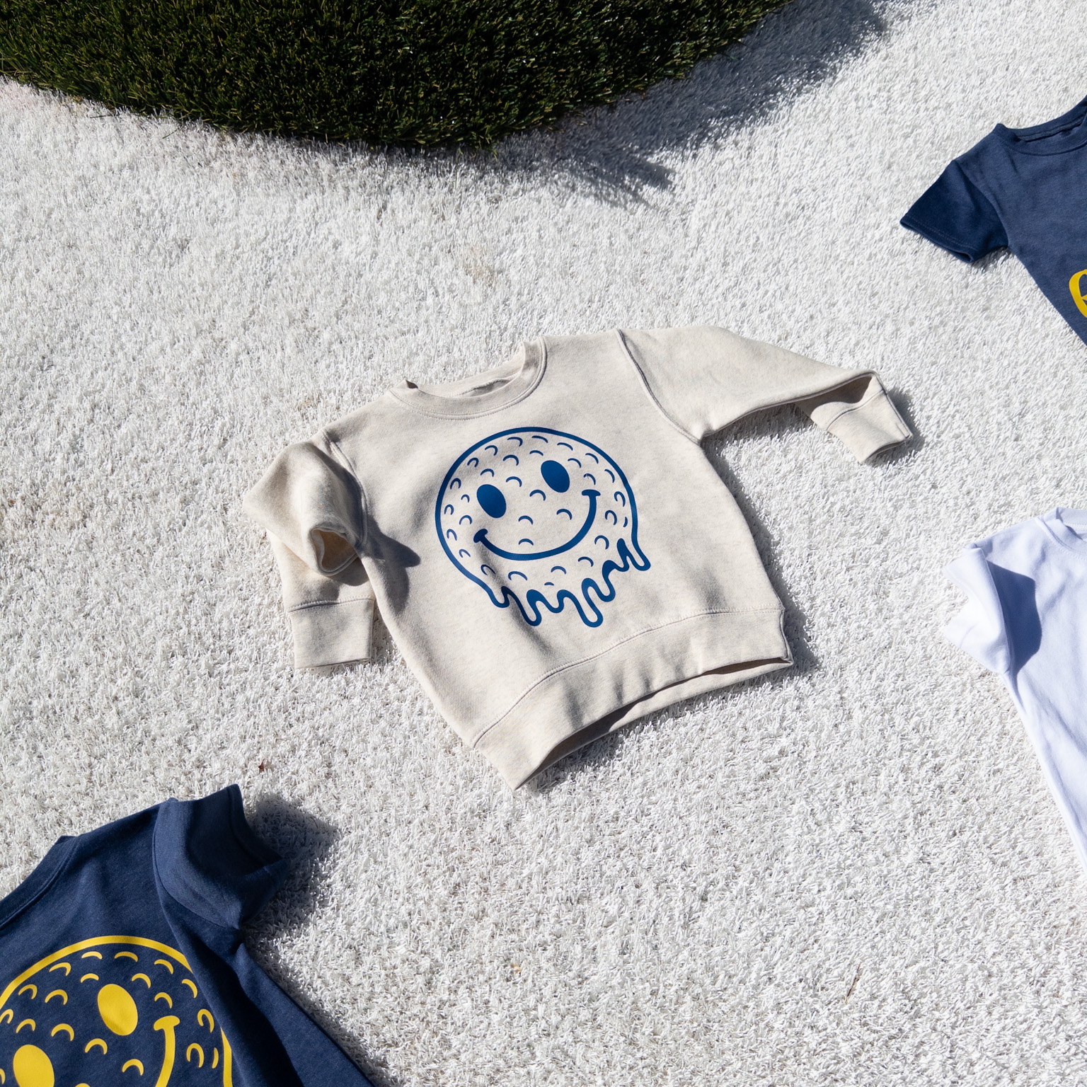 Bring the fun to the fairway with the Buff Bo Outfitters Ace Face Crewneck — a cozy essential for cool kids who know that golf is meant to be played with a smile. This soft oatmeal-colored sweatshirt features our signature dripping golf ball smiley in bold blue across the front, blending sporty energy with a streetwear-inspired edge.
