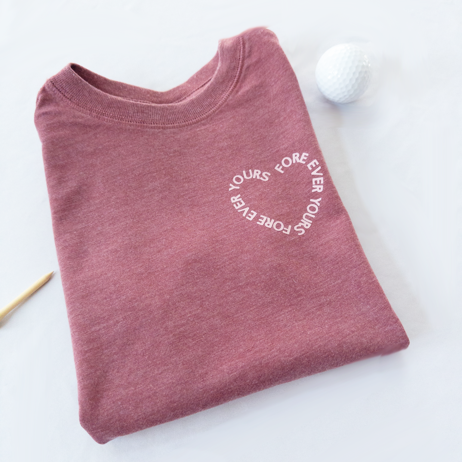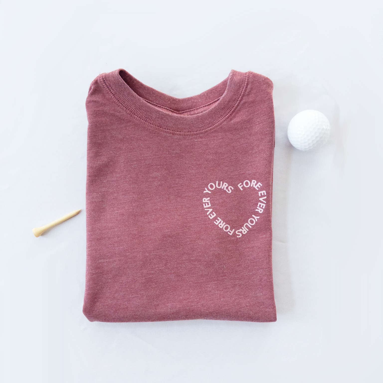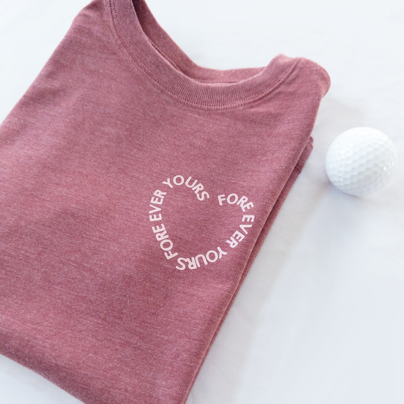 A little love, a little golf, and a whole lot of heart. Our Fore Ever Yours tee features a soft, vintage-washed rose tone with a subtle circular chest print that says it all. Designed for everyday wear and made to feel broken-in from the first swing, this tee is perfect for golf days, play days, and everything in between.