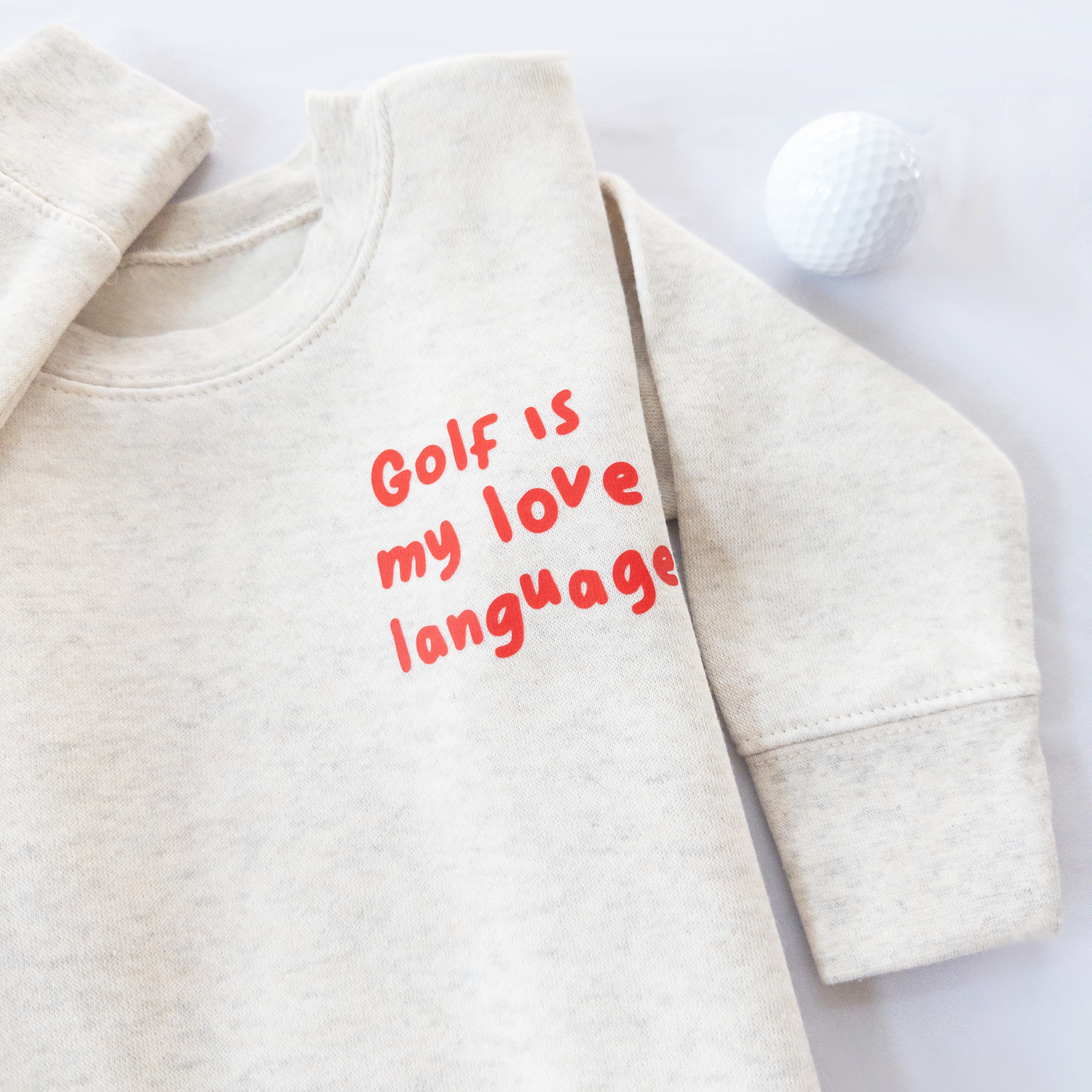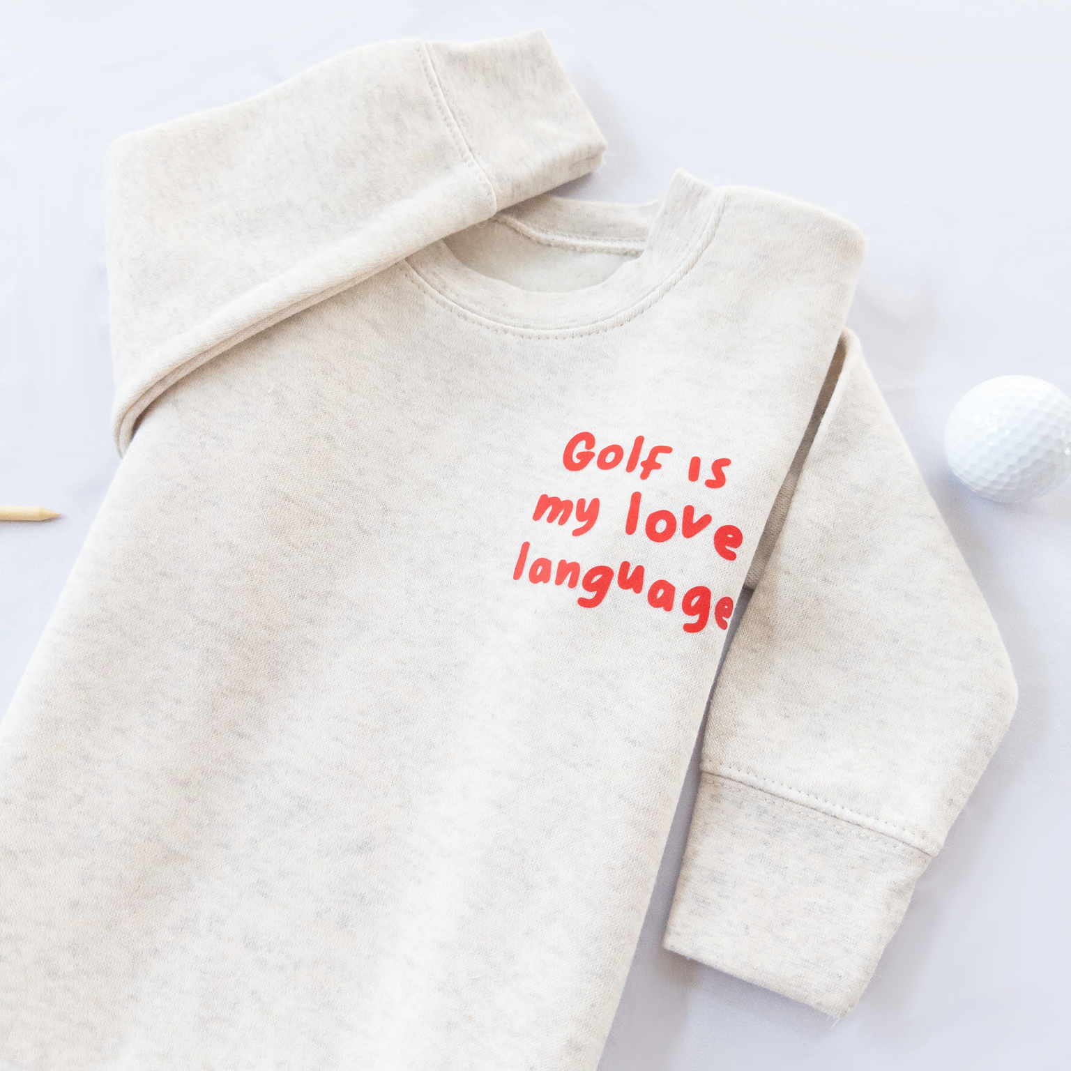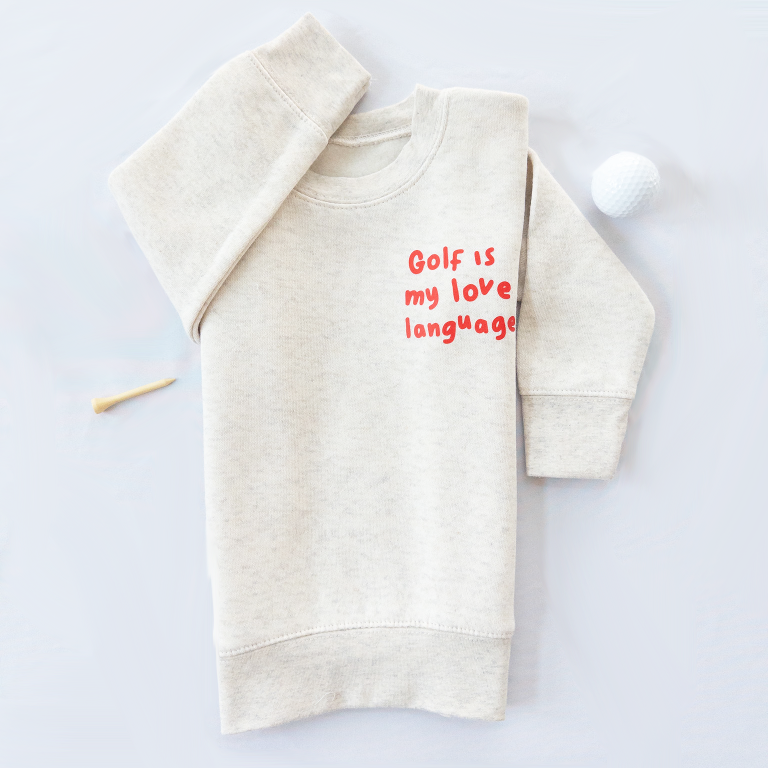 Because some kids say “I love you” with a golf swing. Our Golf Is My Love Language sweatshirt is soft, cozy, and full of heart—featuring a playful red chest print on a classic, neutral base. It’s the perfect layer for cool mornings at the course, cozy days at home, or heading out to cheer on their favorite golfer.