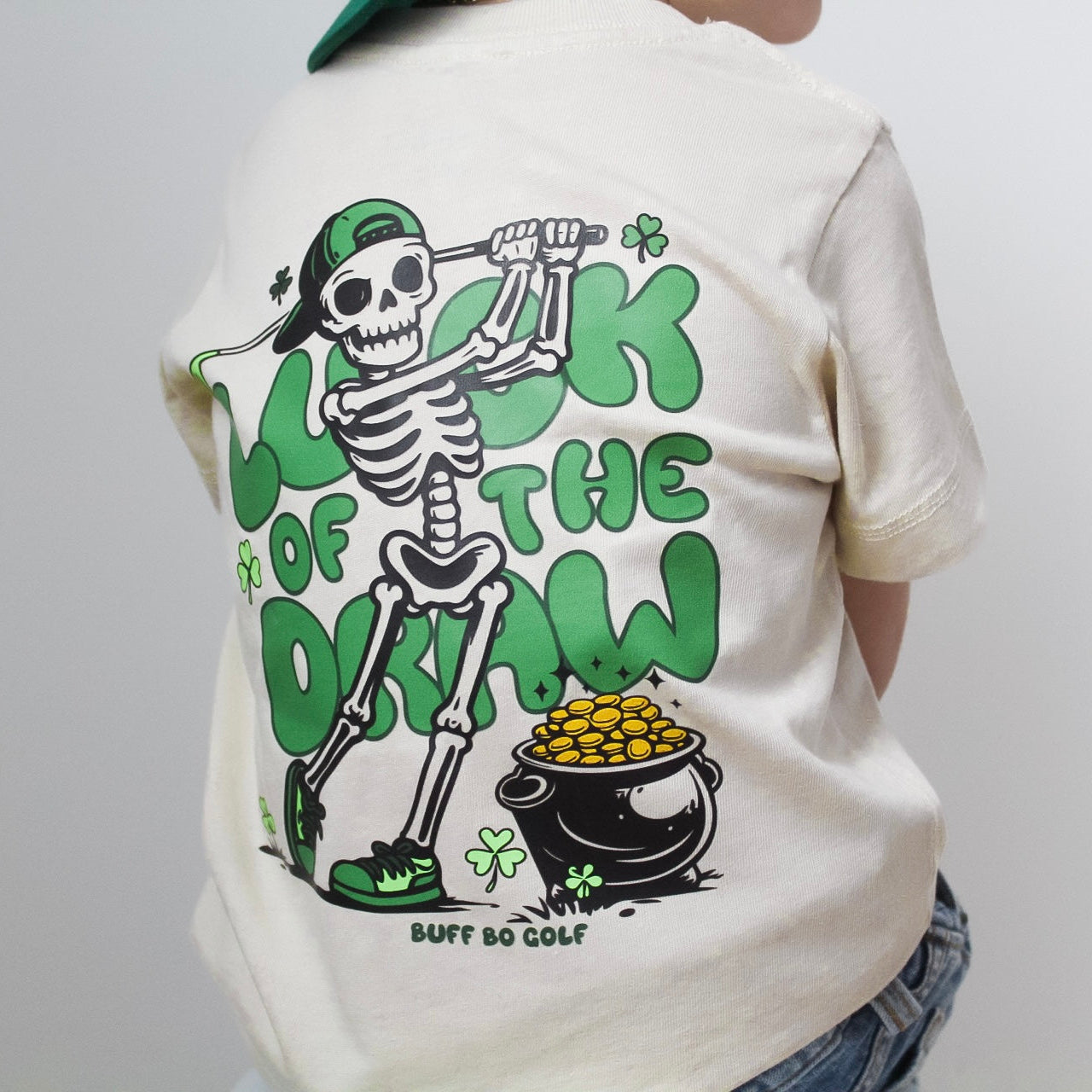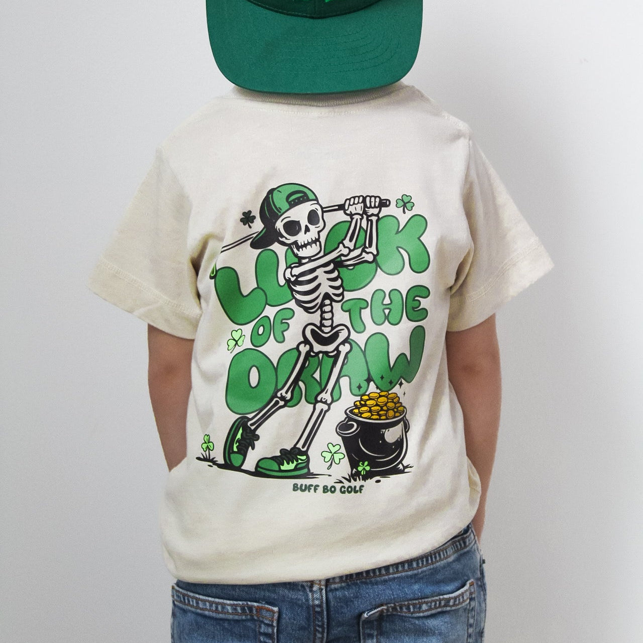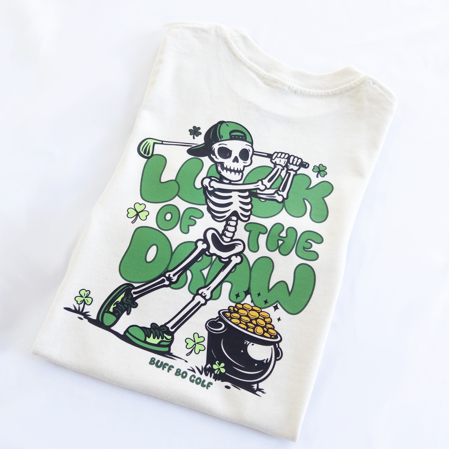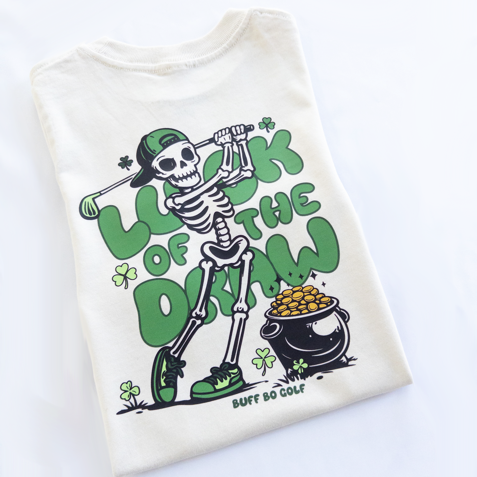 The Luck of the Draw Tee brings St. Patrick’s Day energy to the course with a playful skeleton golfer mid-swing, a pot of gold filled with golf balls, and bold green graphics that pop. It’s the perfect mix of fun and cool—made for kids who love golf, a little luck, and standing out.
