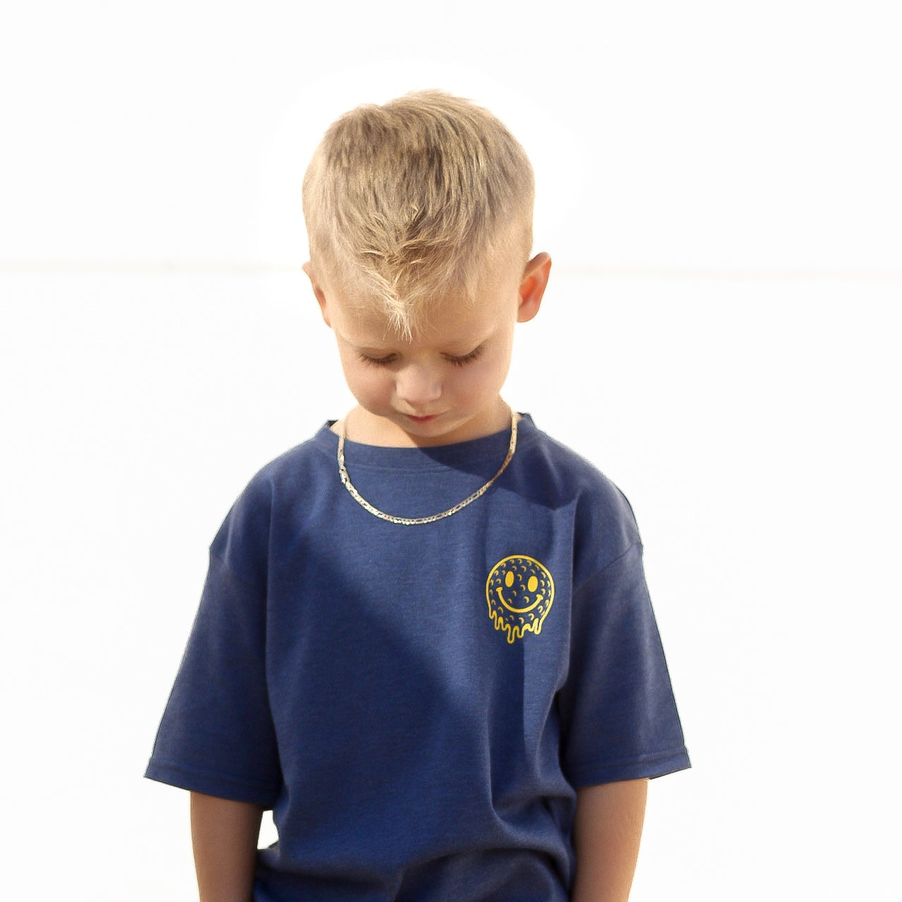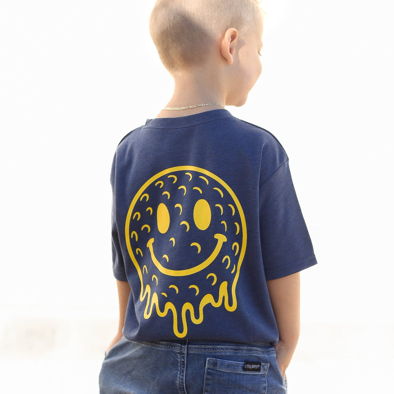 Turn up the fun on and off the course with the Ace Face Tee from Buff Bo Outfitters — a bold staple for young golfers who like to stand out. This navy blue shirt features our signature drippy golf ball smiley front and center (well, pocket-sized on the front and full-sized on the back), combining golf culture with streetwear-inspired flair.