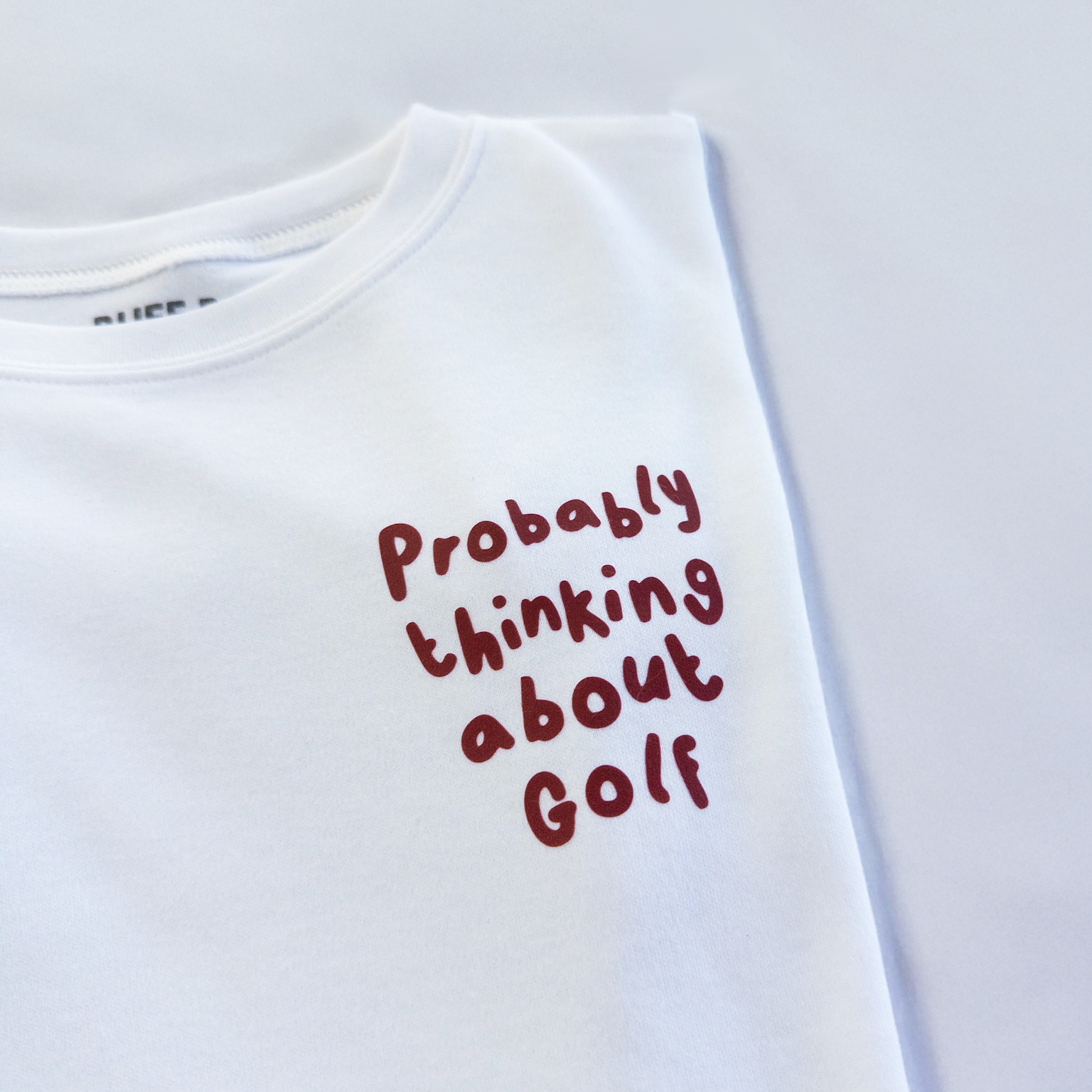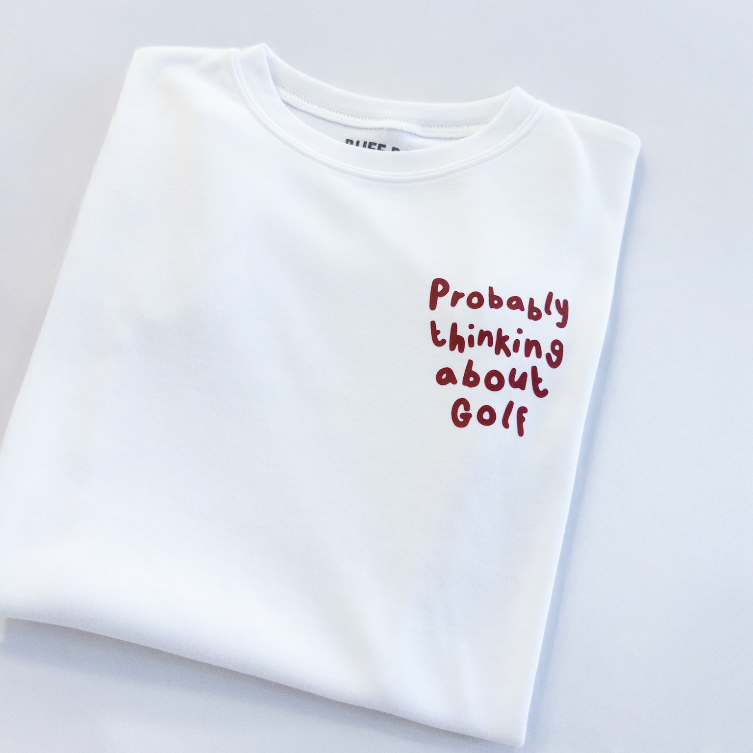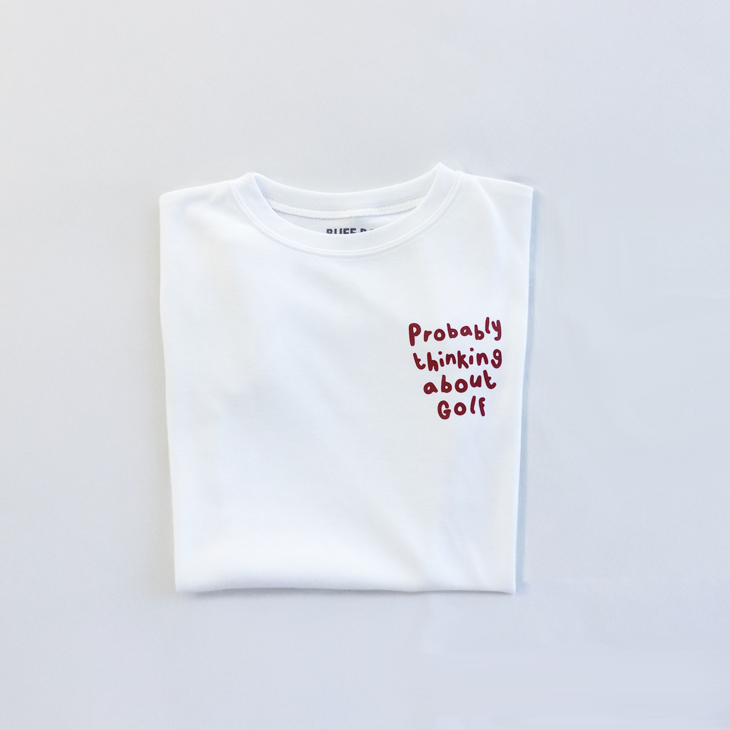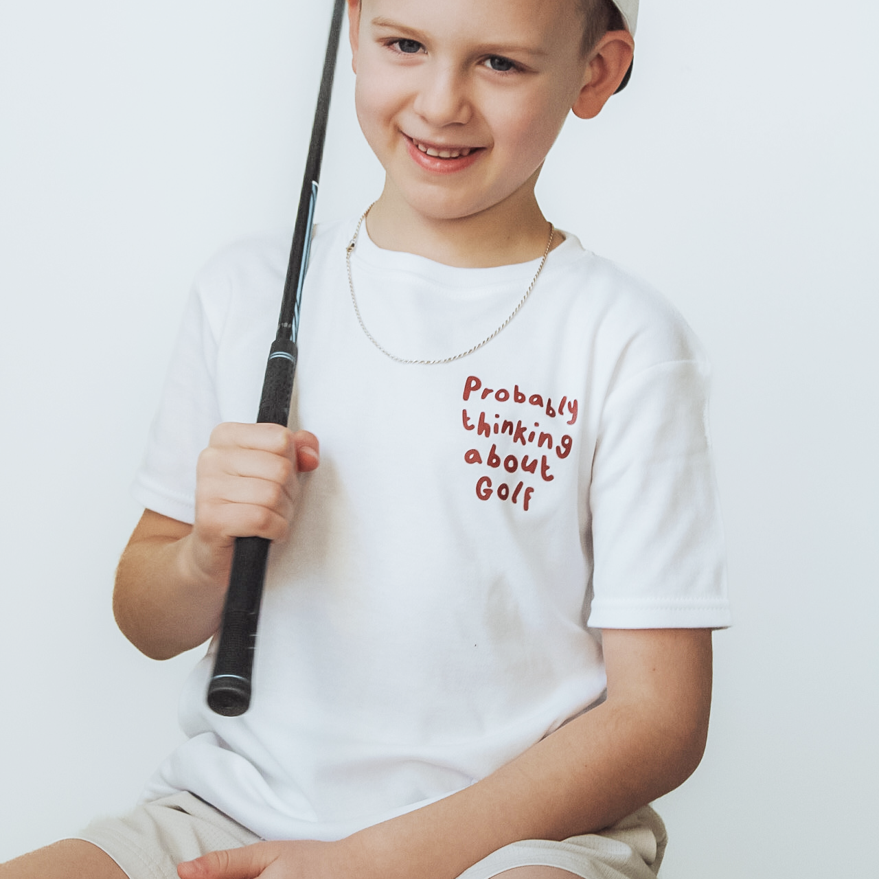 The Probably Thinking About Golf tee is a fun, low-key nod to kids who eat, sleep, and breathe the game.... Read more